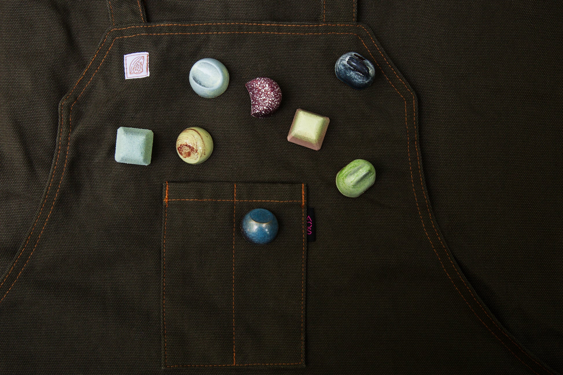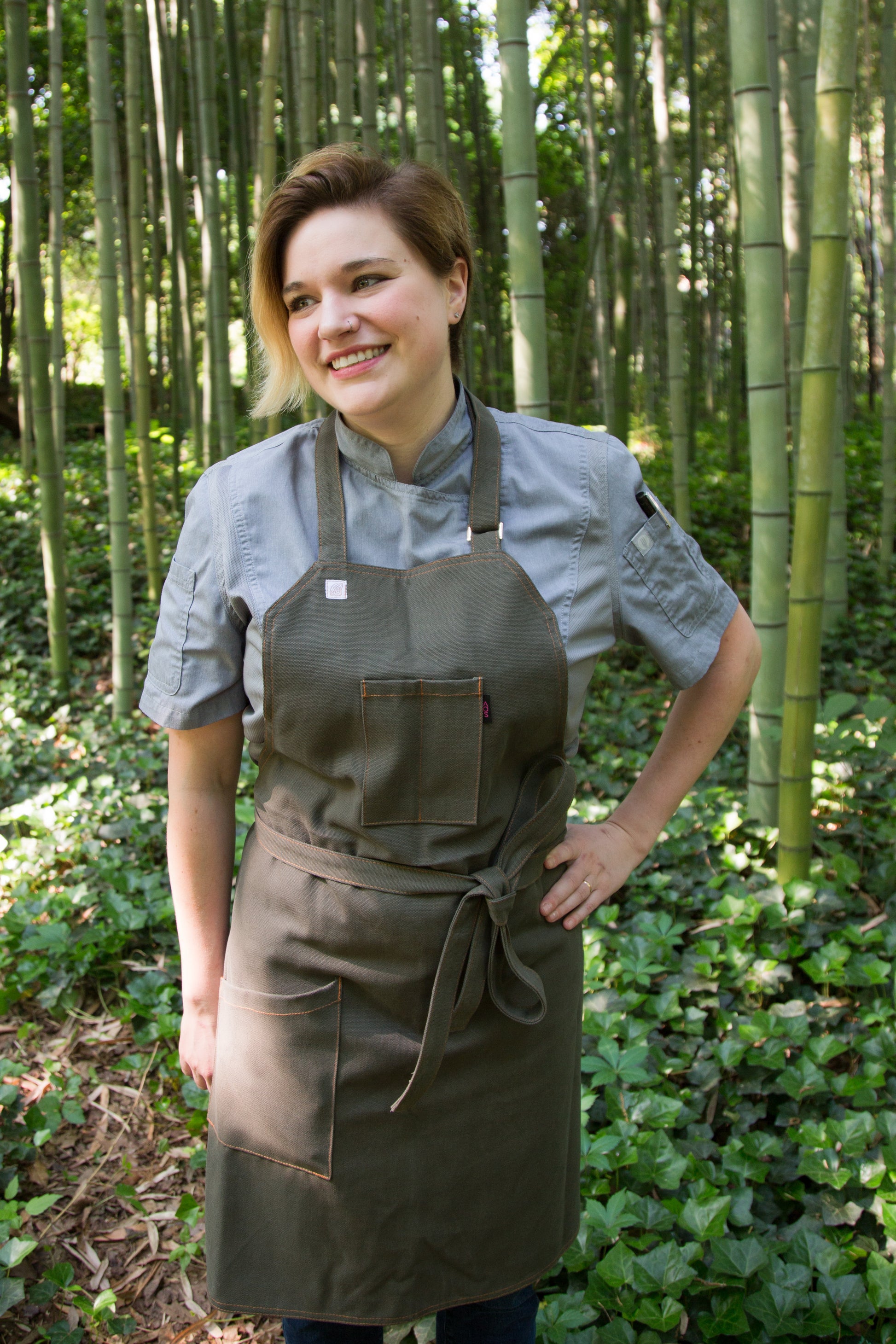 Each forest green apron is hand stitched with copper thread, and finished with the JARDÍ cocoa pod logo.