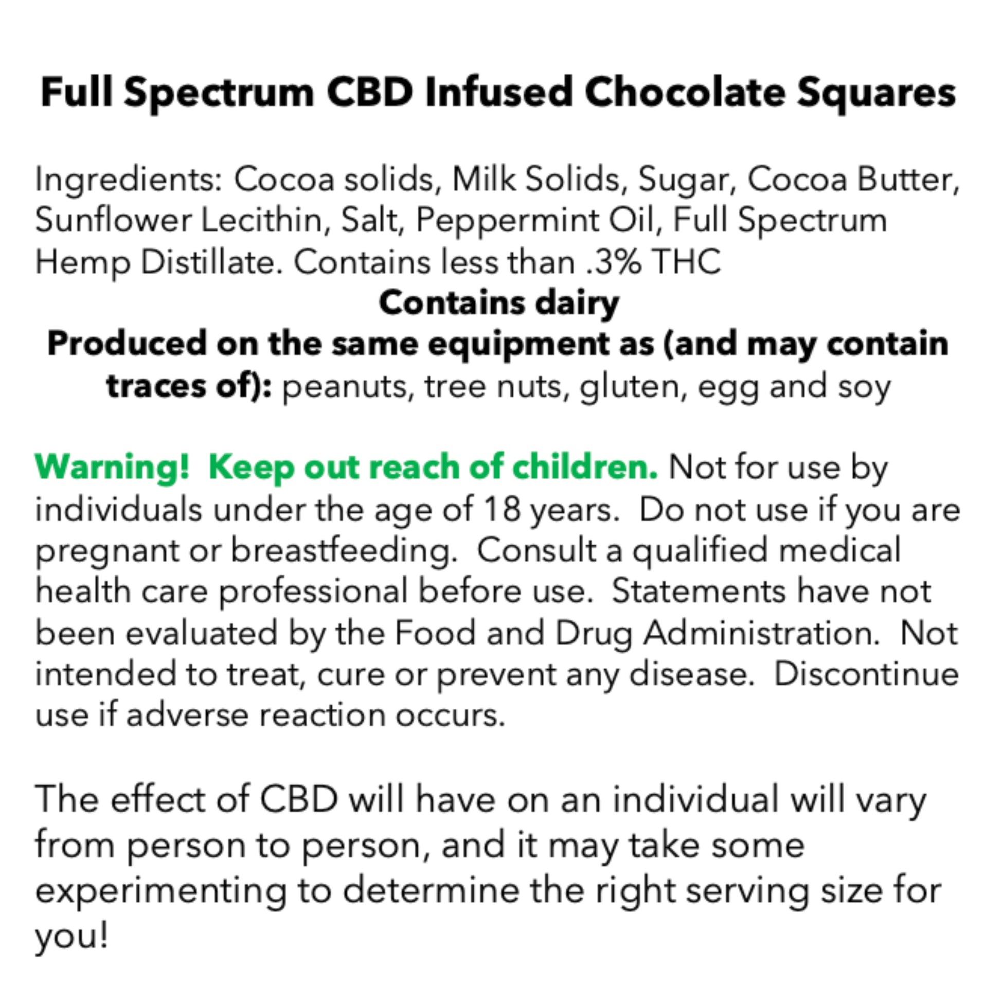 Each square is made of our same high-quality, sustainably sourced chocolate and 25mg of full-spectrum hemp distillate from Second Century Agriculture (located in Ocilla, GA). We've sent each batch to a 3rd party testing facility to ensure it's potency and safety, which you can see by simply scanning the QR code on the back of each package.
